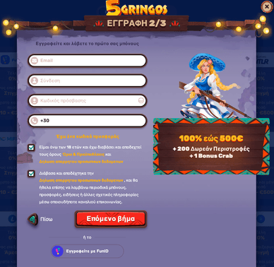 Το 5Gringos προσφέρει διάφορα μπόνους καλωσορίσματος, ανάλογα με τον χαρακτήρα που επιλέγετε. Περιλαμβάνουν μπόνους κατάθεσης και δωρεάν περιστροφές. Λεπτομέρειες μπορείτε να δείτε στη σελίδα προωθήσεων του site.
