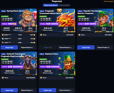 Πρόκειται για μια πολύ ενδιαφέρουσα επιλογή στον τρόπο με τον οποίο οι παίκτες μπορούν να εκμεταλλευτούν τον στοιχηματισμό τους. Συγκεκριμένα, αντί να παίζουν απλά ελπίζοντας να πετύχουν κέρδος, μπορούν να κάνουν ακριβώς το ίδιο σε συγκεκριμένους κουλοχέρηδες που συμμετέχουν σε τουρνουά, και να συγκεντρώνουν πόντους, ώστε να διεκδικήσουν ένα από τα τεράστια έπαθλα που προβλέπονται.