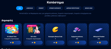Bonus Crab casino είναι μια πρωτότυπη επιλογή που προσθέτει στοιχείο διασκέδασης και ενθουσιασμού στα διαδικτυακά καζίνο. Με κάθε κατάθεση, ο παίκτης αποκτά την ευκαιρία να παίξει σε μια εικονική "Claw Machines" – παρόμοια με τις μηχανές παιχνιδιών με αρπαγή, όπου μπορεί να κερδίσει διάφορα χρήσιμα βραβεία.
