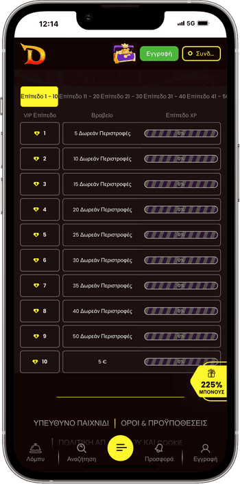 - Επίπεδα 1 – 10: από 5 δωρεάν περιστροφές έως €5 (οι δωρεάν περιστροφές φτάνουν τις 50 στο 9ο επίπεδο)