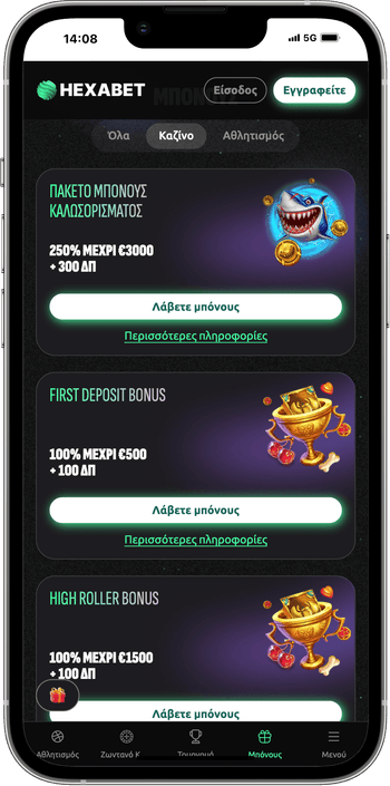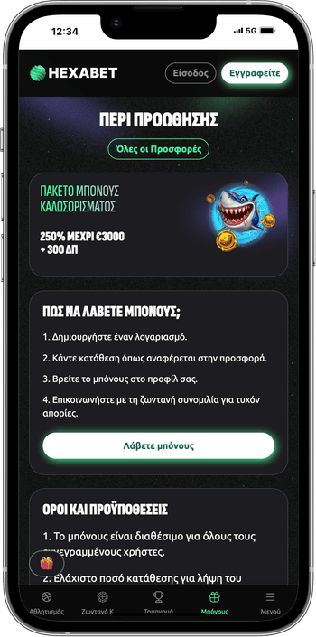 Το πακέτο καλωσορίσματος του Hexabet io είναι ιδιαίτερα πλούσιο και αφορά όλους τους νέους χρήστες. Πρόκειται για ένα μπόνους, που συνοδεύει τις τρεις πρώτες καταθέσεις σας, και δίνει έως €3.000 και 300 δωρεάν περιστροφές. Αναλυτικά: