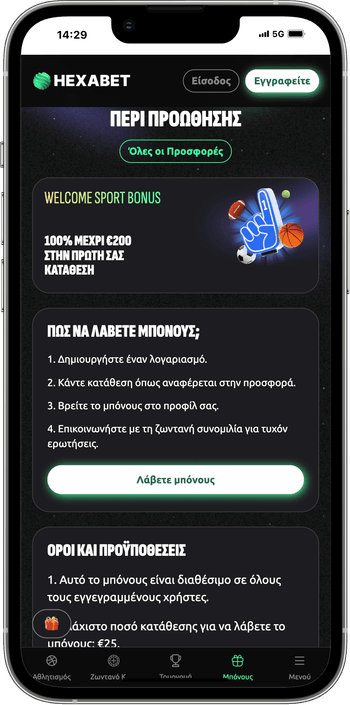 Όπως είναι κατανοητό, οι προσφορές είναι διαθέσιμες και για τους παίκτες, που επιλέγουν τον αθλητικό στοιχηματισμό. Γι’ αυτούς τους παίκτες, έχει σχεδιαστεί ένα μπόνους ειδικά για τις ανάγκες της επιλογής τους. Συγκεκριμένα, προβλέπεται ενίσχυση της πρώτης τους κατάθεσης κατά 100% μέχρι τα €200. Η ελάχιστη κατάθεση για να λάβετε το μπόνους αυτό ανέρχεται τα €25. Ένα μπόνους, που λαμβάνεται με No Risk Bet, έχει απαίτηση στοιχηματισμού 6x επί του συνολικού ποσού του μπόνους.Το μέγιστο ποσό πονταρίσματος για την εκπλήρωση των απαιτήσεων είναι €50 και οι απαιτήσεις θα πρέπει να εκπληρωθούν εντός 10 ημερών από τη λήψη του μπόνους.