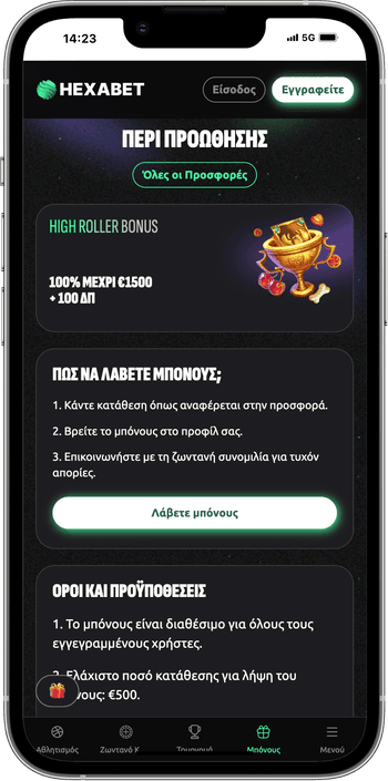 - Μπόνους High Roller: Μπόνους 100% μέχρι τα €1500 + 100 δωρεάν περιστροφές στον κουλοχέρη Gates of Olympus 1000 (Pragmatic Play).