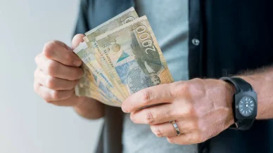 Χαρτονομίσματα σερβικού δηναρίου στα χέρια ενός άνδρα