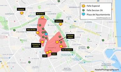 Los conciertos festivos se celebran en escenarios móviles, comienzan por la noche y terminan aproximadamente a las 4:00 de la madrugada del día siguiente. La acción principal tiene lugar en los jardines de Viveros, cerca del Museo de Bellas Artes, en el barrio de El Carmen, en el centro histórico de Valencia, y en la plaza de San Sebastián.