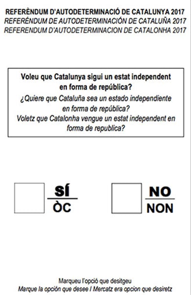 Preguntes a la papereta | 1. «Vol que Catalunya esdevingui un Estat?» 2. (Si la resposta és afirmativa) «Vol que aquest Estat sigui independent?» |