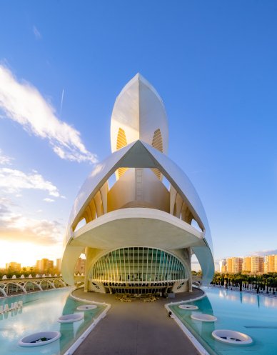 La Ciudad de las Artes y las Ciencias es un conjunto arquitectónico situado en el antiguo cauce del río Turia, en pleno centro de Valencia. Está formado por varios edificios emblemáticos diseñados por el famoso arquitecto Santiago Calatrava: Palau de les Arts Reina Sofia, Hemisfèric, Museu de les Ciències Príncipe Felipe, L'Oceanogràfic.