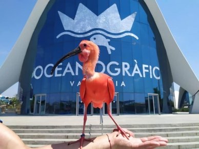 Zazú, el ibis escarlata embajador del Oceanogràfic, frente al edificio de accesos / Oceanogràfic
