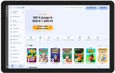 Le CasinoLab Casino se caractérise par un style épuré et un design inspiré d’un laboratoire. La palette de couleurs domine le bleu clair. L’interface est simple et intuitive pour les joueurs. Le menu principal se situe à gauche, avec des liens vers les promotions, la page d’accueil, les jeux, le casino en direct, les paris sportifs, les défis, les tournois, la boutique et la section VIP. Dans le coin supérieur droit, vous trouverez le moteur de recherche, ainsi que les boutons de connexion et d’inscription.
