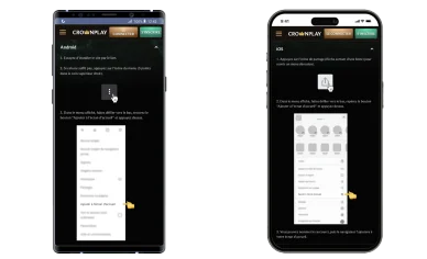 CrownPlay Casino ne propose pas d’application mobile pour Android. Cependant, il est possible d’ajouter un raccourci sur l’écran d’accueil pour un accès plus rapide. Sur Android, il suffit d’ouvrir le menu (trois points en haut à droite) et de sélectionner "Ajouter à l’écran d’accueil". Sur iOS, la procédure est similaire : il faut cliquer sur l’icône de partage en bas de l’écran, puis choisir "Ajouter à l’écran d’accueil".