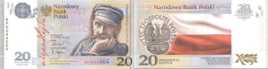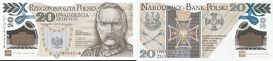 - Le zł20 est un billet émis en 2018 dans les couleurs violette et orange qui présente le portrait de Józef Piłsudski à l'avers et le drapeau et les armoiries polonaises au revers. Le billet mesure 150 mm sur 77 mm.