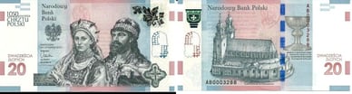 - Le zł20 est un billet émis en 2015 qui mesure 144 mm sur 77 mm. Les couleurs sont le bleu et le rose. L'avers contient les portraits de Doubravka de Bohême et du prince Miezko, les armoiries de la Pologne, la croix et l'un des sols de l'église catholique. Le revers comprend les images de la cathédrale de Gniezno et du calice royal de Trzemeszno.