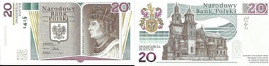 - Le zł20 est un billet émis en 2015 qui mesure 138 mm sur 69 mm. Il présente le portrait de Jan Długosz et un livre ouvert sur l'avers. Le verso contient les images des armoiries de Wienawa et de la cathédrale du Wawel à Cracovie.
