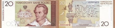 - Le zł20 est un billet jaune émis en 2009 qui mesure 138 mm sur 69 mm. Il présente à l'avers le portrait du poète Juliusz Słowacki et son chalet. Le revers représente le monument de Sigismond III Vasa à l'arrière-plan d'un extrait de poème et la place du château à Varsovie.