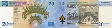 - Le zł20 est un billet émis en 2017 qui mesure 144 mm sur 72 mm. On y trouve une icône de la Vierge noire de Częstochowa ainsi que les armoiries polonaises sur l'avers. Le revers présente les paysages de Częstochowa.