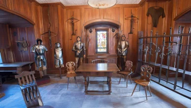 Le premier étage du château de Haut-Koenigsbourg a d’abord été, comme le voulait l’habitude médiévale, affecté aux logis. Restauré au XXe siècle, il est demeuré dans le goût de l’époque et se visite évidemment.