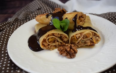 - Minden palacsintát kenjünk meg a diós töltelékkel, és tekerjük fel.