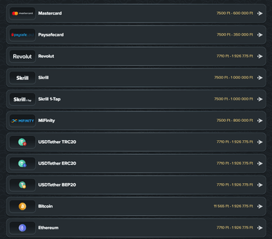 💹 Befizetési/kifizetési módok | Revolut, Mastercard, Visa, Skrill, Mifinity, Paysafecard, kriptovaluták |