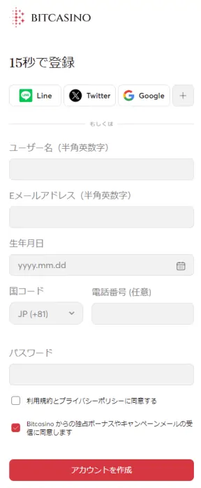 また、ビットカジノではGoogle、Facebook、LINE、Twitter、Telegram、AppleなどのSNSアカウントを利用した新規登録も可能です。