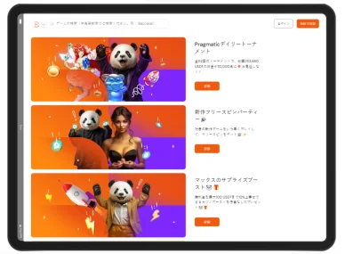 ビットカジノのサイトはダークパープルとオレンジを基調としたスタイリッシュなデザイン。落ち着いた雰囲気で長時間のプレイでも目に優しい設計となっています。ナイトモードも搭載されているので、暗い環境でも快適に利用できます。画面中央には、注目のゲームやボーナスキャンペーンが大きなバナーで表示。トップメニューには、「ゲーム」「ライブカジノ」「トーナメント」「プロモーション」「ロイヤリティ」「ヘルプセンター」などの主要なカテゴリが配置されており、目的のページへスムーズにアクセス可能です。また、画面右下には24時間対応のライブチャットサポートが設置されており、迅速なサポートが受けられる点も高評価!もしゲームサイトに不慣れでも直感的に使える仕様で、日本のプレイヤーからも良い評判を得ているビットカジノ。オンラインゲームでわずらわしい思いをしたくないゲーマーには最適のカジノサイトだと言えるでしょう。