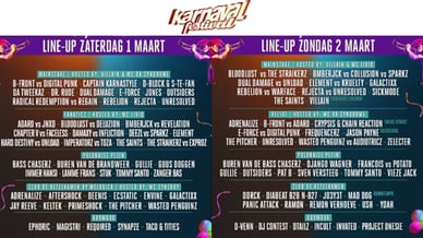 De volgende artiesten en bands treden op tijdens Karnaval Festival op zaterdag 1 maart: