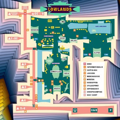 Lowlands is verdeeld in drie zones: Planet Paradise, Cape Lowlands, Lake Lowlands. In de eerste zone bevinden zich de scènes Heineken, Lima, Echo en Julia. In de tweede vind je de podia Bravo, India, X-Ray, Hacienda, The Block, Adonis en ArmadiLLow. Lake Lowlands is de thuisbasis van het Alpha-hoofdpodium.