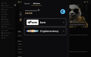 Hoewel je geen grote lijst met bonussen zult zien bij GoldenPanda casino, zullen de inzetvereisten van de beloningen je opvallen. De cashback kan bijvoorbeeld onmiddellijk worden opgenomen op de hoofdrekening en worden gebruikt voor de volgende inzetten.