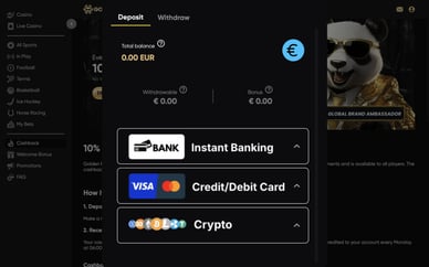 - Selecteer het betalingssysteem. Om geld te storten naar Golden Panda casino kun je bankkaarten en overschrijvingen gebruiken, maar ook anonieme betalingen vanaf een cryptocurrency account.