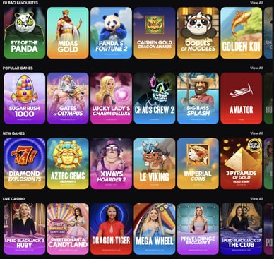 De spelbibliotheek van Golden Panda casino is met de grootste zorg samengesteld. Op de hoofdpagina vind je de namen van de merken die hun ontwikkelingen aanbieden. Onder hen zijn Evolution Gaming, Novomatic, Iconic21 en vele anderen. Het aangeboden assortiment bestaat uit: