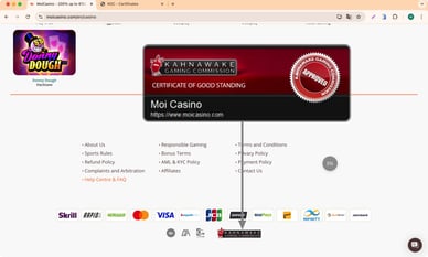 - Klik op het Kahnawake casino online licentie icoon. Ga naar de officiële website van de Kahnawake toezichthouder om te zoeken. Gebruik de bedrijfsnaam of het vergunningsnummer van de eigenaar.