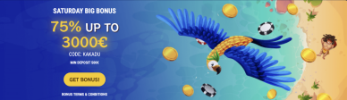 Gokkasten spelers die graag risico's nemen en weinig interesse hebben in gratis spins hebben een passend aanbod. Met de grote bonus van zaterdag voor high rollers zonder FS kun je in één keer tot 3 000 EUR terugstorten op je bonus rekening. De beloning kan worden gebruikt voor slots, op voorwaarde dat er geen free spins op het account staan. Om te profiteren van de uitbetaling moet je een storting doen (vanaf 500 EUR) en de Kakadu casino bonus code opgeven. Kopieer "Kakadu" en gebruik het om deel te nemen aan de promotie voor gokautomaten.