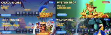 Wedstrijden tussen klanten zijn een andere aantrekkelijke mogelijkheid om beloond te worden. De voorwaarden zijn eenvoudig: je speelt op gokkasten en verzamelt punten. Na afloop van de trekking geeft Kakadu casino cadeaus in de vorm van echt geld of gratis spins. Momenteel kun je proberen te winnen in de volgende toernooien: