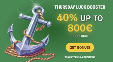 Geregistreerde gokkers genieten elke donderdag van een unieke aanbieding. Onder de bonusvoorwaarden kunnen klanten geld storten en tot €800 terugkrijgen. De grootte van de beloning wordt bepaald op basis van de aangekondigde inzet - 40% van het stortingsbedrag wordt teruggegeven aan de spelers. Denk aan de Kakadu casino promo code - HIGH