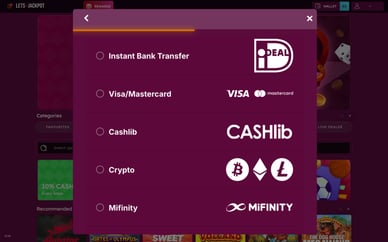 - Het selecteren van een betalingssysteem. Letsjackpot stelt voor om bankkaarten, e-wallets en cryptocurrency te gebruiken om je account te financieren. De snelheid van de transactie hangt af van de keuze van je voorkeursmethode.
