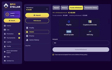 - Maak jezelf vertrouwd met de transactievoorwaarden. Let op de limieten voor het bedrag dat je wilt opnemen op een persoonlijke rekening. Het totale bedrag aan transacties in Spinstellar casino mag niet hoger zijn dan €30.000 per maand. Daarnaast is de verwerkingstijd van het verzoek maximaal 72 uur.