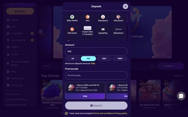 - Een handige betaalmethode kiezen. De lijst telt 23 opties. Daaronder zijn bankoverschrijvingen, creditcards, elektronische portemonnees en portemonnees met cryptocurrency. Let op het minimale stortingsbedrag, dat afhangt van het gekozen betalingssysteem.