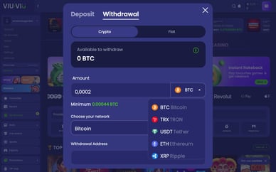 De lijst van beschikbare systemen voor de transactie bevat cryptocurrencies. Hoewel de Viu-Viu website de mogelijkheid van uitbetaling naar een bankrekening aangeeft, was het niet mogelijk om deze optie te gebruiken. Om geld te ontvangen naar een cryptocurrency account zijn verschillende acties mogelijk: