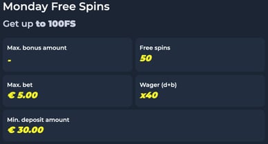 Stort elke maandag om tot 100 gratis spins te verkrijgen. Het aanbod is actief voor alle geregistreerde gokkers met een actieve account. Gokkers kunnen ze besteden aan bonus slot spelen.