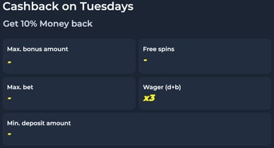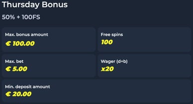 Spelers kunnen inzetten vanaf 0,20 euro. Om hun winsten op te nemen, zijn spelers verplicht deze minimaal drie keer in te zetten. De fondsen kunnen op elk moment worden gespeeld in alle spellen op de website die zich in de categorie "Bonus" bevinden.