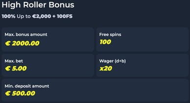 De high roller bonus is beschikbaar direct nadat een speler voor de eerste keer stort. Echter, u moet het kiezen en een code aangeven bij het aanmelden op het platform om het te claimen. U kunt tot 1.000 euro plus 100 FS krijgen als u het kiest.