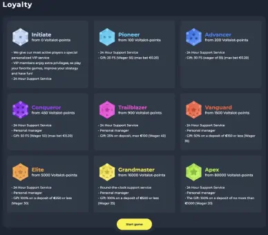 Bezoek de Voltslot Casino site en klik op de sectie "Loyaliteit" om te zien wat de VIP-club te bieden heeft. Spelers worden meteen lid nadat ze zich hebben geregistreerd. Het loyaliteitsprogramma heeft negen niveaus en tal van privileges die spelers kunnen verkrijgen als ze regelmatig inzetten op het platform en speciale punten verzamelen.