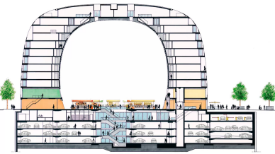 Rotterdam Markthal is een overdekte winkelruimte. De gemeente Rotterdam schreef een wedstrijd uit voor het beste project dat niet alleen een enorme markt, maar ook een woongebouw en een parkeerterrein zou omvatten.