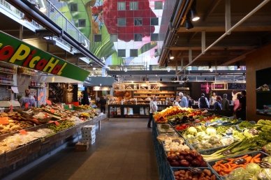Een enorme markt die een architectonisch kunstwerk genoemd kan worden. Een gebouw met woonappartementen bedekt het als een hoefijzer. Winkels, restaurants en cafés zijn er in overvloed. Op de begane grond zijn kruidenierswinkels en kraampjes met allerlei soorten fruit uit verschillende landen.