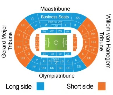 Actieve Feyenoord-fans zitten op de noordelijke tribune op de onderste rij. Fans van bezoekende teams zitten meestal op de zuidelijke tribune, op de bovenste verdiepingen.