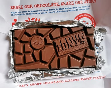 Tony Chocolonely produceert uniek gevormde repen met ongelijke stukjes, die symbool staan voor de oneerlijke verdeling van de winst in de chocolade-industrie, waar boeren slechts een klein deel van de winst ontvangen.