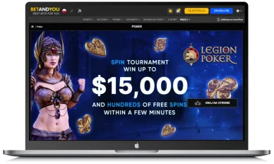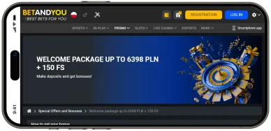 - Pakiet powitalny do 6393 zł plus 150 DS, który składa się z 4 bonusów od czterech pierwszych depozytów. BetandYou bonus za rejestrację — 100% do 1280 zł + 30 DS; bonus przy drugiej wpłacie — 50% do 1491 zł + 35 FS; premia przy trzecim depozycie — 25% do 1700 zł plus 40 DS; promocja od czwartego depozytu — 25% do 1920 zł + 45 FS. Wymagany obrót środkami bonusowymi i wygranymi z darmowych spinów: 35x.
