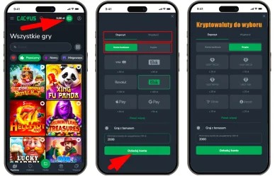 Klienci, którzy grają w kasynie internetowym na pieniądze, mają do dyspozycji 12+ kryptowalut, w których mogą wpłacać depozyty i wypłacać wygraną. Mogą także korzystać z Google Pay, tradycyjnych kart płatniczych, Jeton, Apple Pay, Blik. Cactus kasyno nie pobiera żadnych prowizji za dokonanie depozytu i wypłatę środków.