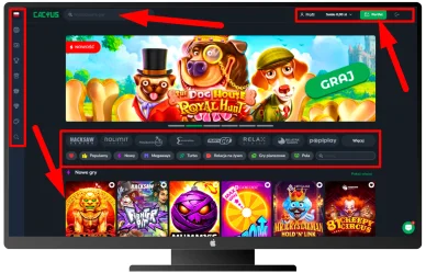 Pośrodku strony głównej Cactus PL zostały umieszczone banery promocji i bonusów. Po lewej stronie znajduje się Menu z odnośnikami do najważniejszych sekcji, w tym Sloty, Gry hazardowe z jackpotami, Turnieje, Wsparcie (ikona czatu live widnieje w prawym dolnym rogu). Przyciski Logowanie i Rejestracja znajdziemy w prawym górnym rogu. Linki do regulaminów zostały umieszczone w stopce strony.