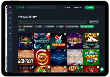 W Cactus Casino online w sekcji Gry Planszowe oprócz ruletki i gier karcianych znajdziemy także różne wersje keno, bingo i kości, m.in. Dice Clash / BGaming, Super Keno / KA Gaming, 88 Bingo 88 / Belatra Games. Pasjonaci gier hazardowych typu instant, crash czy scratchówek powinni odwiedzić zakładkę Turbo.