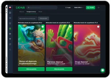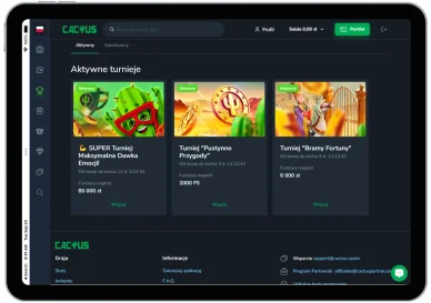 Klienci kasyna internetowego mogą nie tylko uzyskać atrakcyjny Cactus Casino bonus od depozytu kryptowalutowego, ale także brać udział w różnych turniejach w grach slotowych z wysokimi wygranymi. Dużą popularnością wśród klientów kasyna cieszą się Turniej Bramy Fortuny (pula nagród: 6000 zł) i Pustynne Przygody (łączna liczba darmowych spinów do wygrania: 2000).